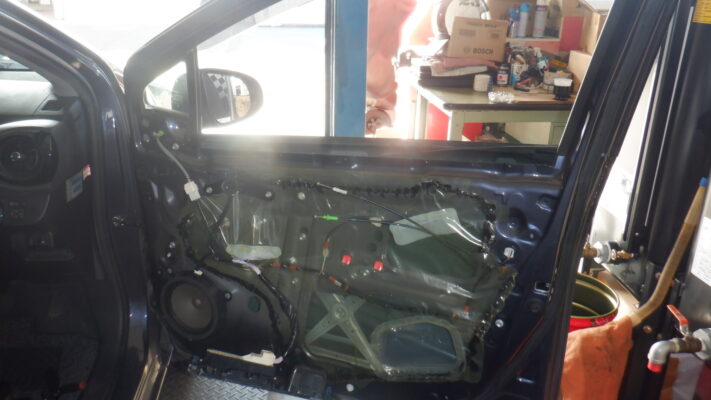 運転席ドアガラスの交換でご入庫頂きました。 写真ではわかりにくいですが、ガラスが白濁していてドアミラー等がかなり見にくい状態です。 事故につながる恐れがあるのでガラスを交換します。 新品ガラスを装着して修理完了です。 ありがとうございました。