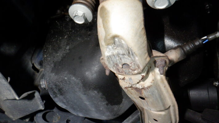 触媒とフロントパイプのつなぎ目から排気漏れしていましたが、マフラー本体が歪んでいます。
