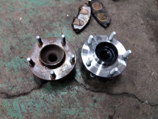 右前のハブベアリングが原因だったので交換していきます。(上の写真は取り外し後)