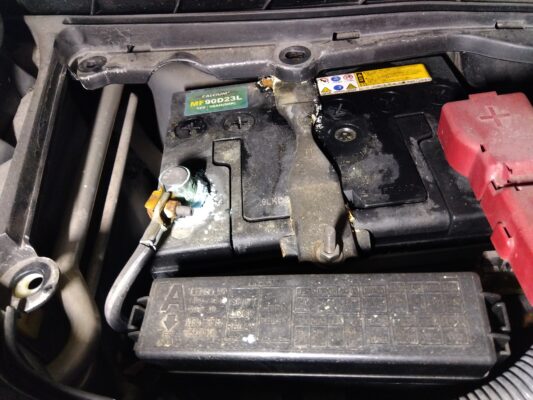 バッテリー端子に青白い粉が付着していたのとバッテリー液がもれていたので